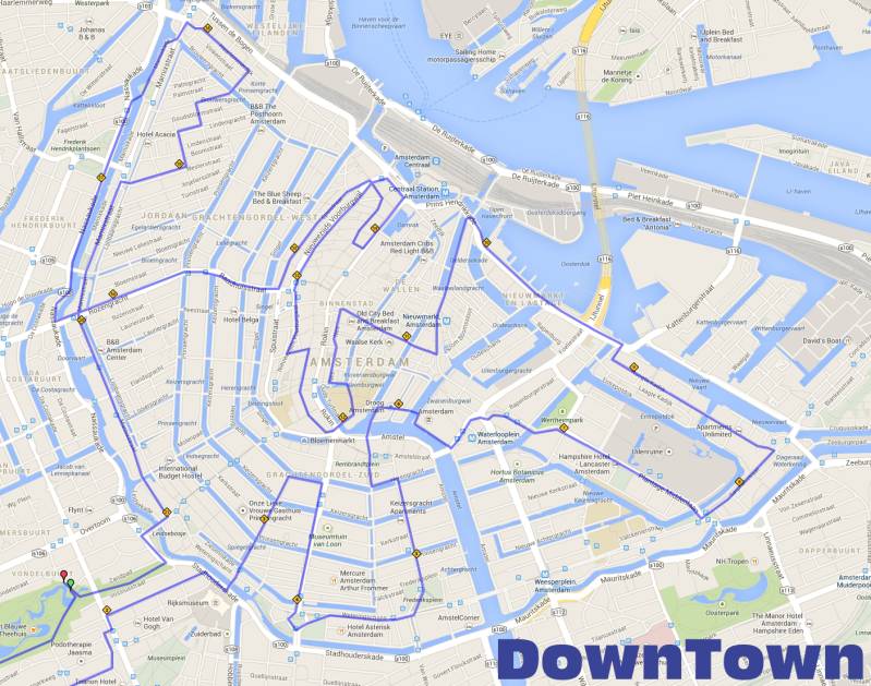 Onze route begint begint bij het Spuiplein en we lopen dan de Kalverstraat in, om naar wat leuke winkels te kijken. Daarna gaan we een zijstraatje in om vervolgens naar Amsterdam Dungeon( een spookhuis)te gaan. Vanaf daar lopen we naar de Dam, daar kan je bijvoorbeeld kijken naar straatartiesten of je kan duiven voeren. Vervolgens gaan we naar de Damrak zodat je even wat kan eten of even naar de Bijenkorf kan gaan. Als we daar klaar zijn gaan we naar de Oude Kerk, zodat je even...... we lopen een stukje langs allemaal straten zodat je ook wat huizen kan zien die daar staan. We gaan ook langs het Centraal Station , vanaf daar kan je eigenlijk overal naar toe met het openbaar vervoer(zoals de metro en de trein). Uiteindelijk komen we bij de Buiksloterwegveer(een pond). We varen dan een stukje over het IJ en we komen dan uit bij Noord en lopen dan naar het Overhoeksplein. Daar kan je een toren zien en het EYE Film Instituut. Daarna lopen we terug naar de pond en gaan weer terug naar de overkant. We lopen als laatste naar de Herengracht zodat jullie een gedeelte van de Grachtengordel kunt zien. Langs de grachten zijn ook huizen met prachtige gevels. We lopen een gedeelte van de Herengracht uit en gaan dan in de Raadhuisstraat en lopen weer naar het Spuiplein.